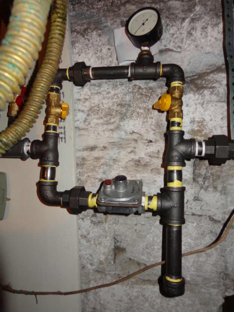My regulator setup is a little fancier than needed, because I had a low pressure meter on hand and wanted it installed so I could read gas pressure as supplied and after the regulator. You might be able to get a home regulator installed for around $50 less than this setup.